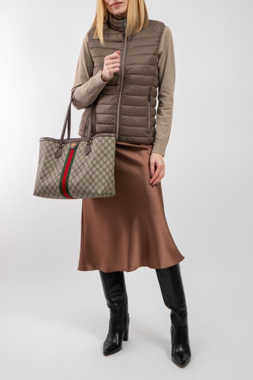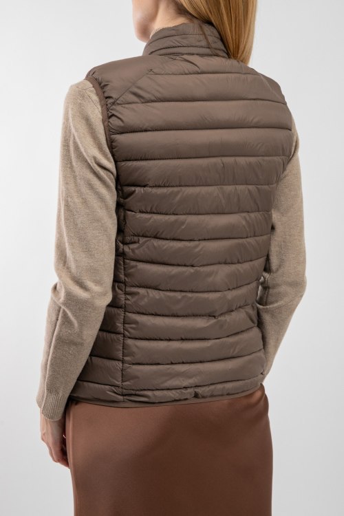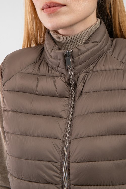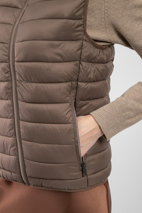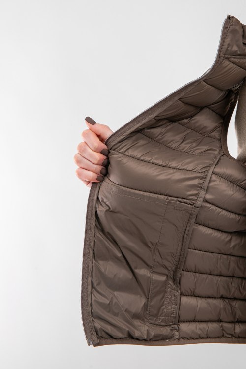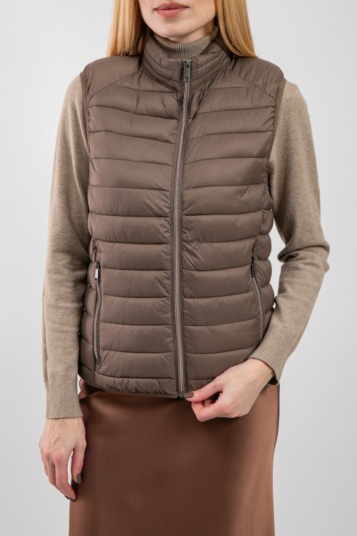 Женский коричневый жилет из полиамида от Devred (Дэврэд). Стеганый дизайн, высокий воротник-стойка, застежка на молнию, прорезные карманы на молнии, модель утепленная синтепухом.