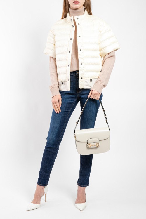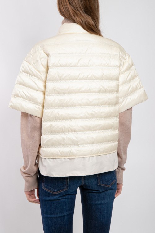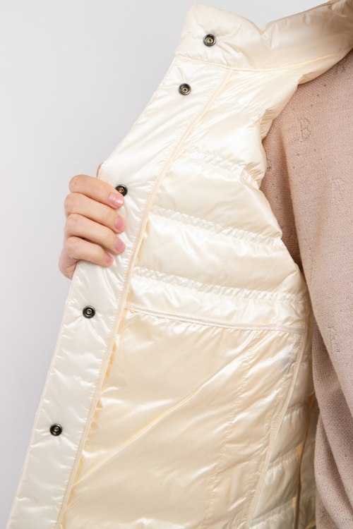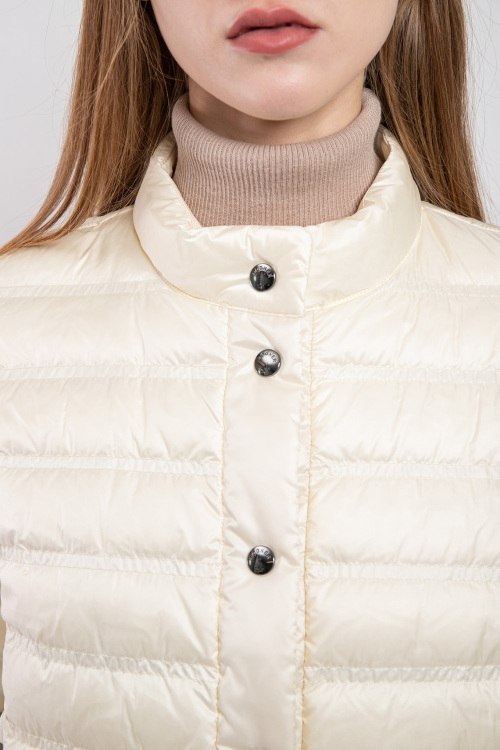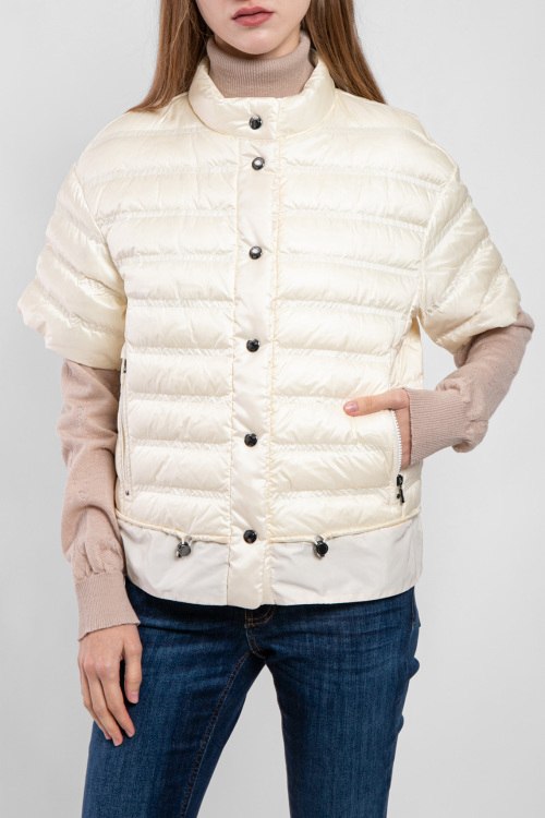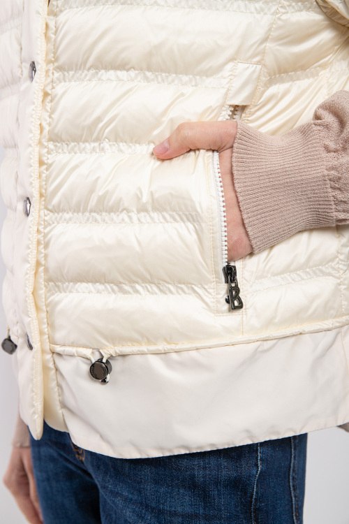 Женский жилет на пуху молочного оттенка Patrice-D от Bogner (Богнер). Стеганый дизайн, воротник-стойка, короткий рукав, боковые карманы на молнии, застежка на кнопки, классическая длина, наполнитель из микса пуха и пера