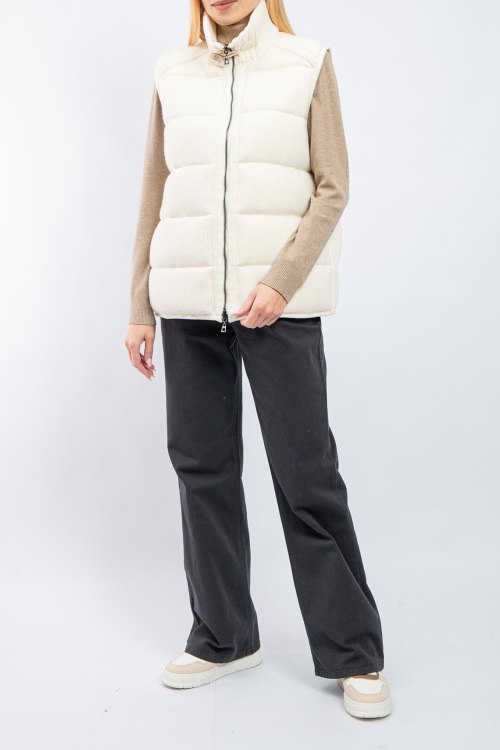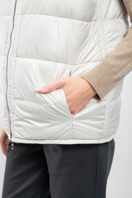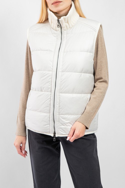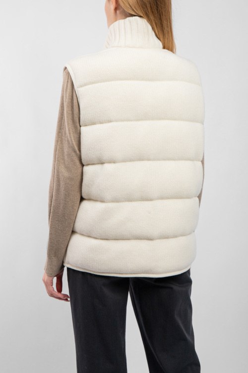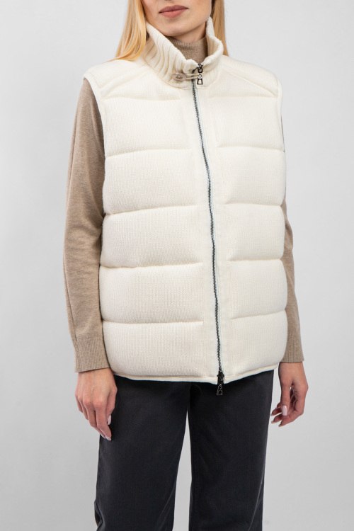 Женский кремовый двусторонний жилет из шерсти и кашемира на пуху от Diego M (Диего М). Стеганый дизайн, высокий воротник с застежкой, боковые карманы, застежка-молния, классическая длина, наполнитель из микса пуха и пера. Замеры для размера 44: длина: 65 см, ширина по груди: 57 см, ширина по талии: 57 см.