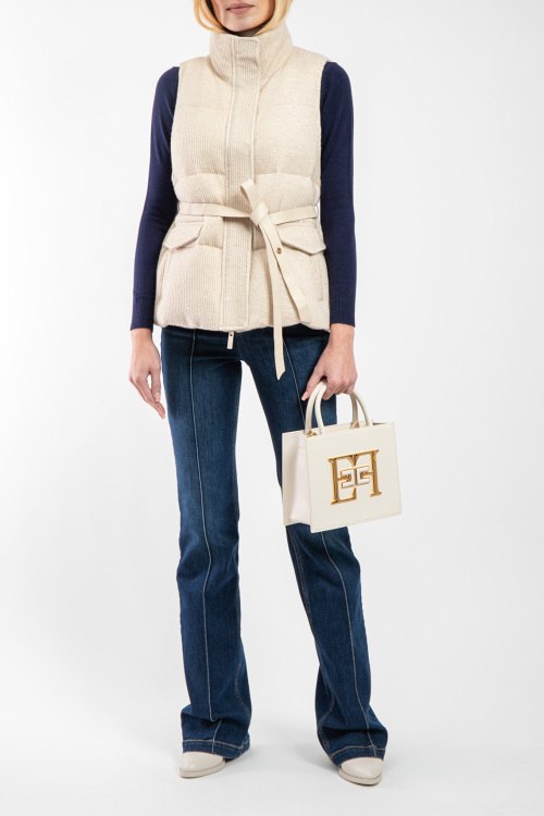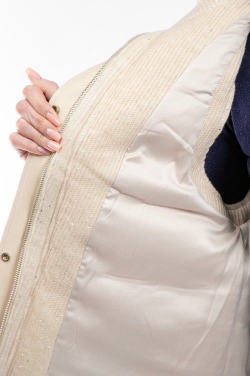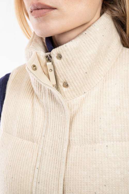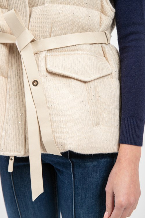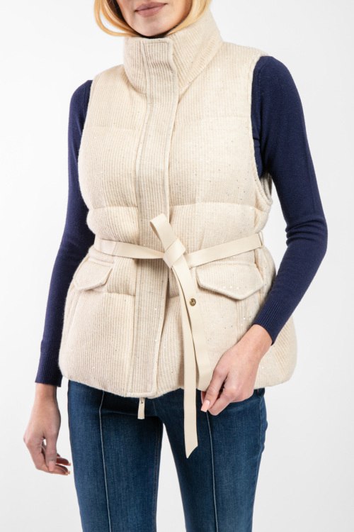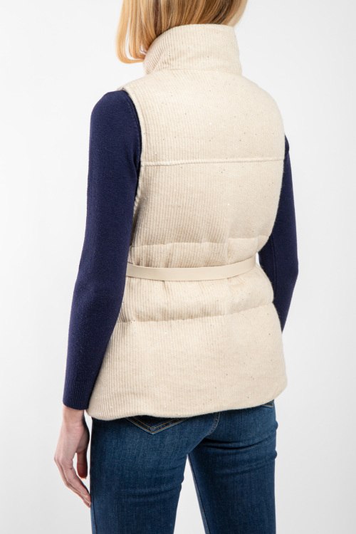 Женский кремовый кашемировый жилет на пуху от Loro Piana (Лоро Пьяна). Модель с примесью шерсти, декор пайетками по всей поверхности, высокий воротник, застежка на молнию и кнопки, в талии с поясом, передние карманы с клапаном, классическая длина, наполнитель из микса пуха и пера