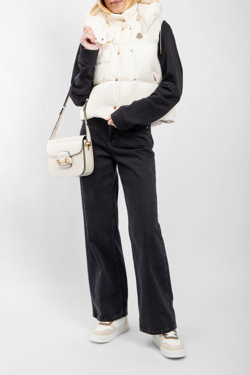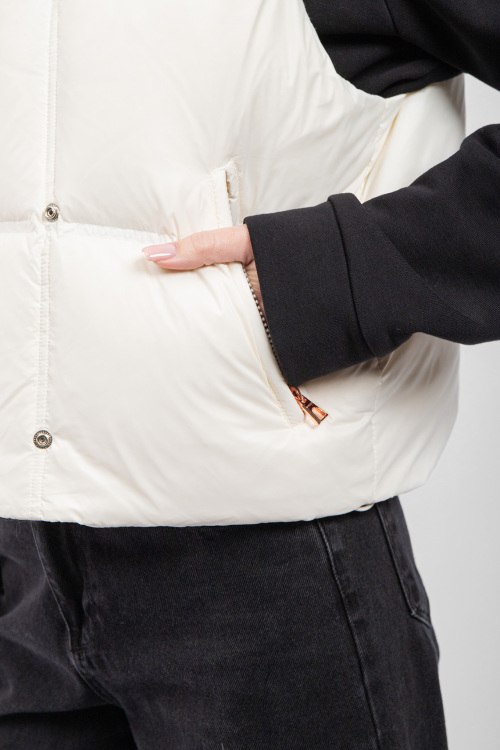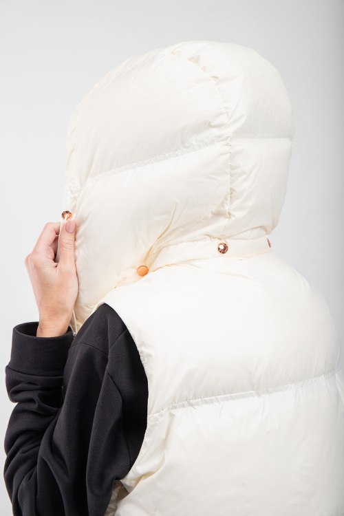 Женский кремовый жилет Pario на пуху со съемным капюшоном от Moncler (Монклер). Стеганый дизайн, высокий воротник, съемный капюшон, нашивка с логотипом на груди, боковые карманы на молнии, карман с клапаном на груди, застежка на кнопки. Укороченная модель до середины бедра, наполнитель из микса пуха и пера.