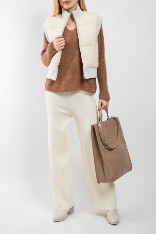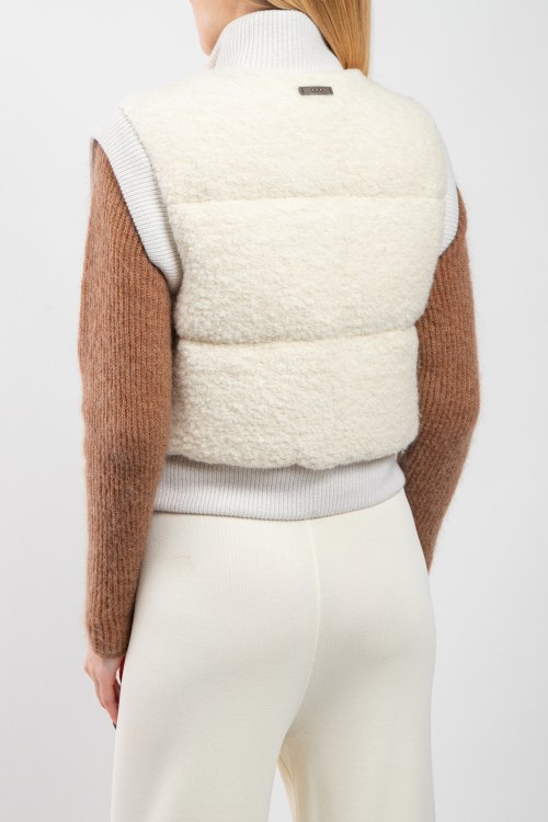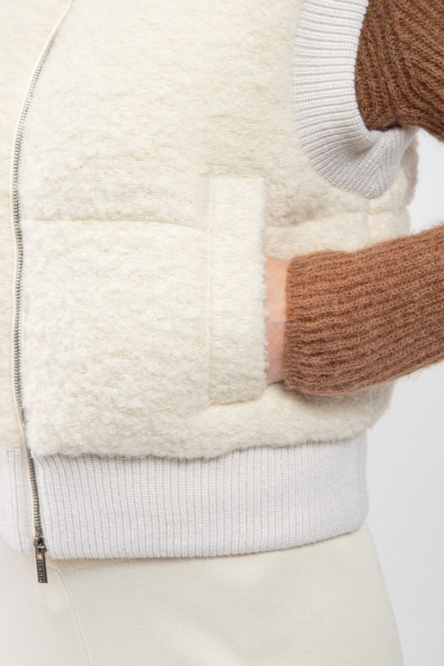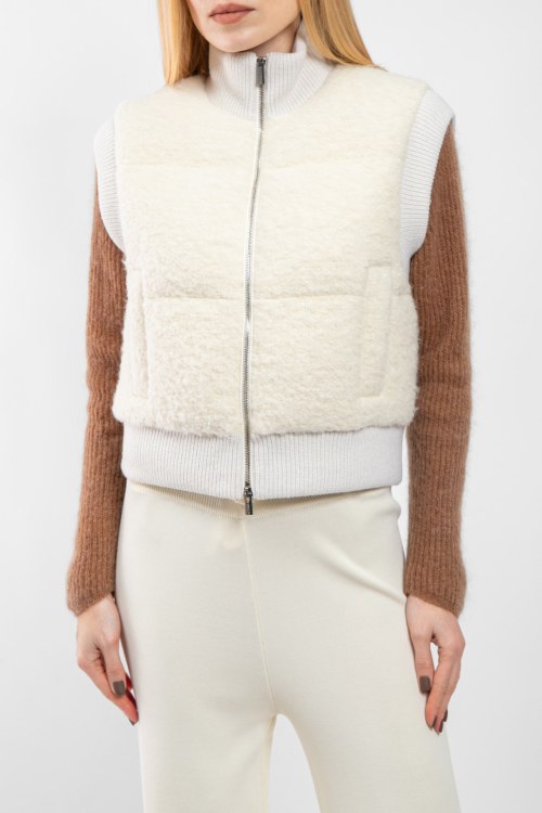 Женский жилет молочного оттенка из шерстяного микса от Peserico (Пезерико). Высокий воротник-стойка, застежка на молнию, трикотажная резинка на воротнике и по низу изделия, прорезные карманы.