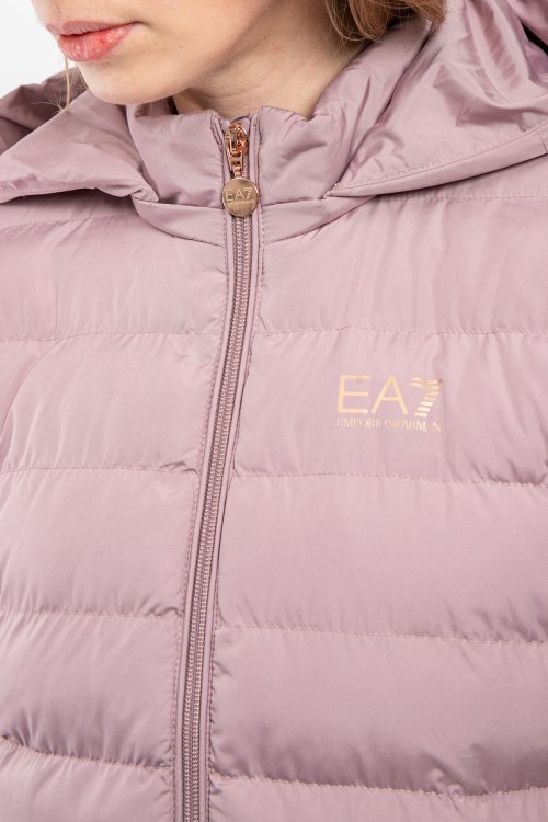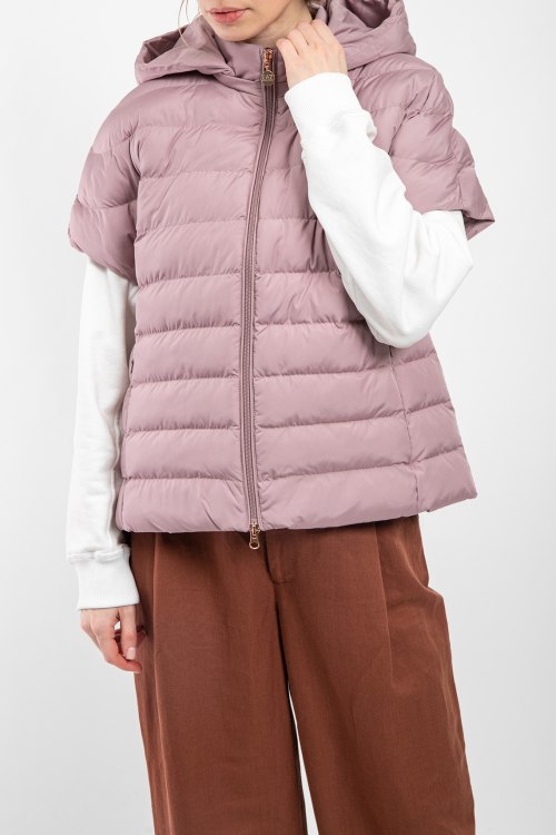 Детали: Женский розовый жилет из полиэстера от Armani (Армани). Стеганый дизайн, застежка на молнию, короткие рукава, съемный капюшон, прорезные карманы, модель утепленная синтепоном, логотип бренда на груди