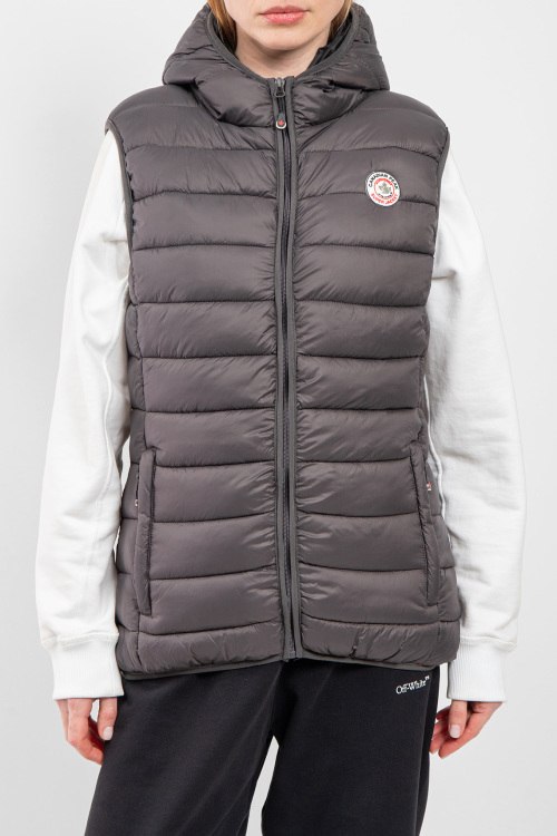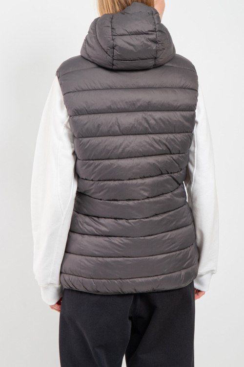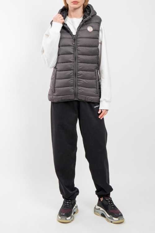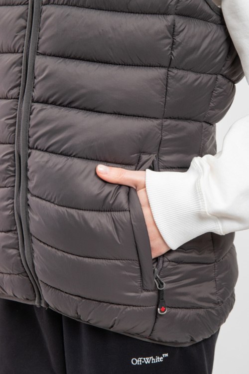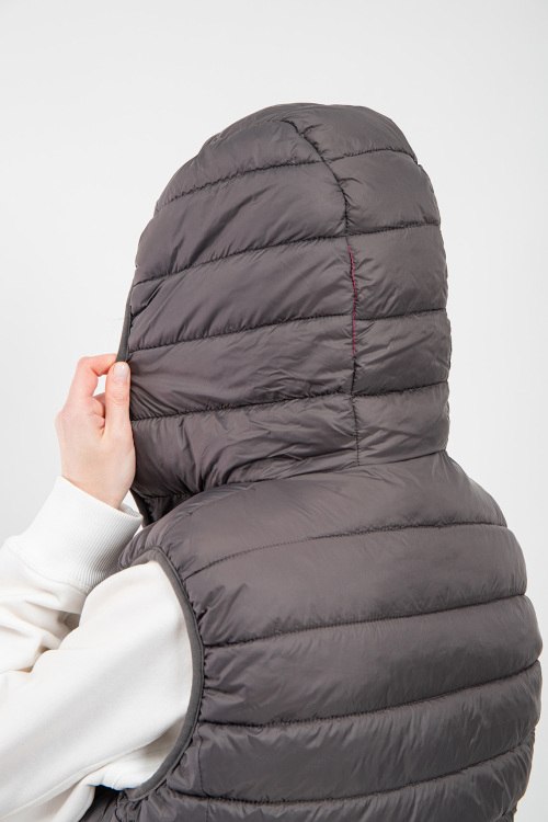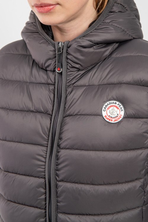 Женский серый утепленный жилет от Canadian Peak (Канадиан Пик). Стеганый дизайн, вшитый капюшон, логотип на груди, боковые карманы, застежка-молния, удлиненная длина.