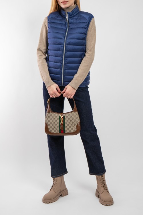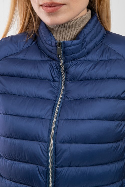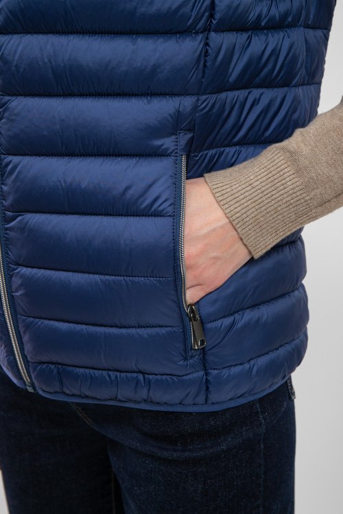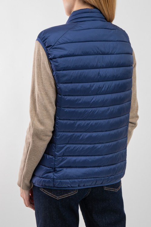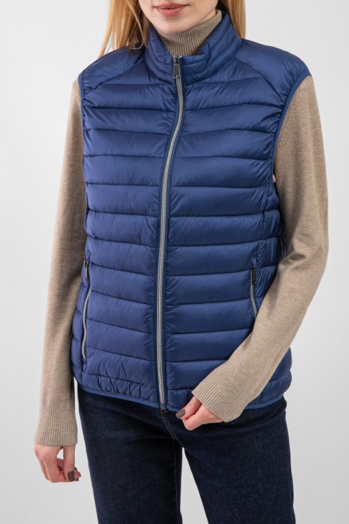Женский темно-синий жилет из полиамида от Devred (Дэврэд). Стеганый дизайн, высокий воротник-стойка, застежка на молнию, прорезные карманы на молнии, модель утепленная синтепоном.