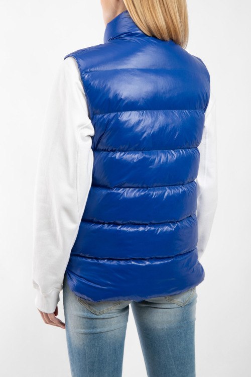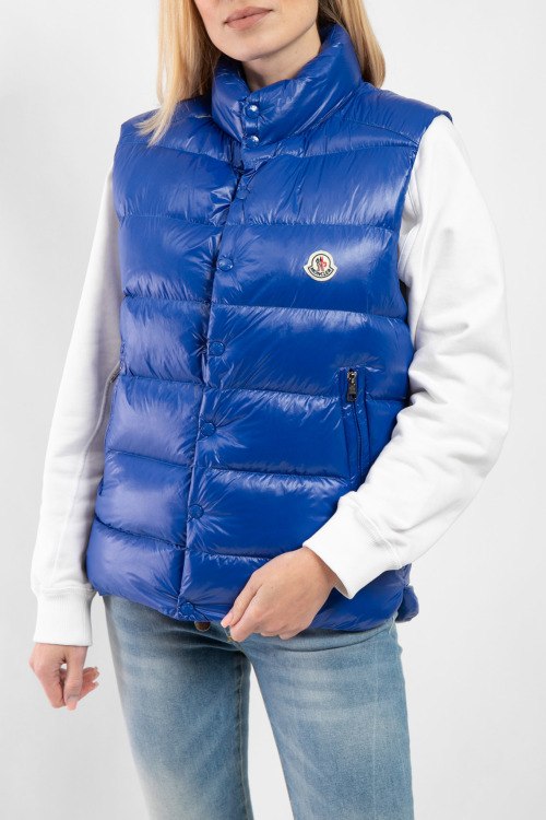 Женский синий жилет на пуху Tibb от Moncler (Монклер). Стеганый дизайн, высокий воротник-стойка, застежка на молнию и кнопки, боковые карманы на молнии, внутренние карманы, патч-лого на груди, классическая длина, наполнитель из микса пуха и пера.