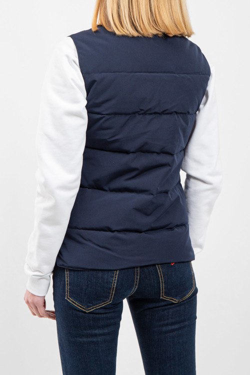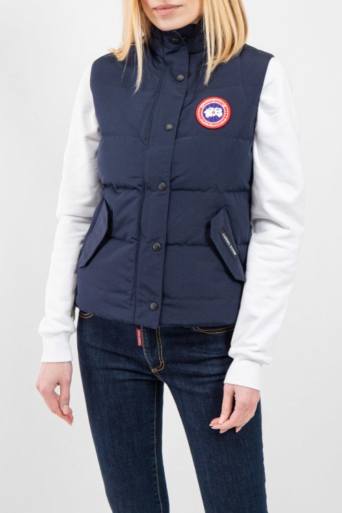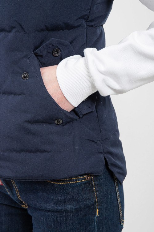 Женский темно-синий стеганый жилет от Canada Goose (Канада Гус). Стеганый дизайн, высокий воротник, нашивка с логотипом на груди, боковые карманы, застежка на молнию и кнопки, пуховый наполнитель, классическая длина.
