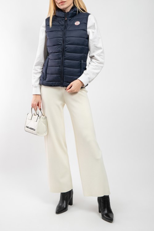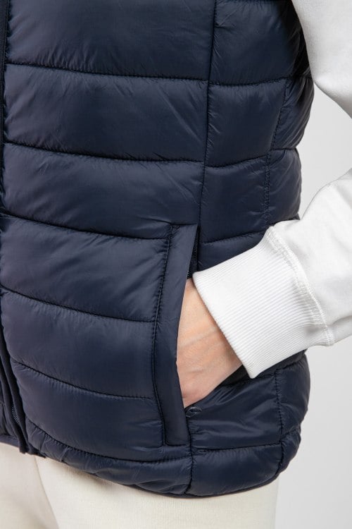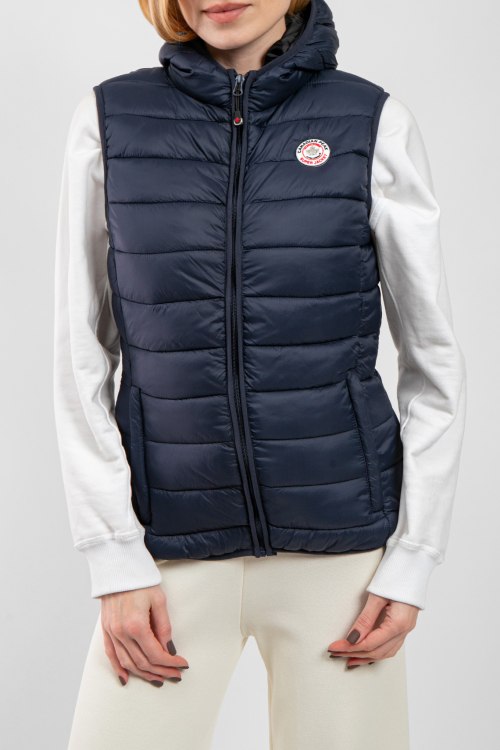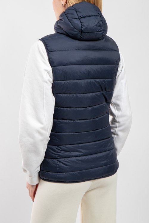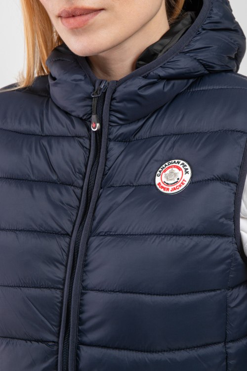 Женский темно-синий жилет из полиамида от Сanadian Peak ( Канадиан Пик). Стеганый дизайн, застежка на молнию, прорезные карманы, вшитый капюшон, патч-лого на груди, модель утепленная синтепухом.