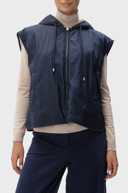 Детали: Женский двухсторонний утепленный жилет Levante от Max Mara Weekend (Макс Мара Викенд). Темно-синий и бежевый цвет, вшитый капюшон, боковые карманы на кнопке, принт логотипа на спине, классическая длина, легкий наполнитель