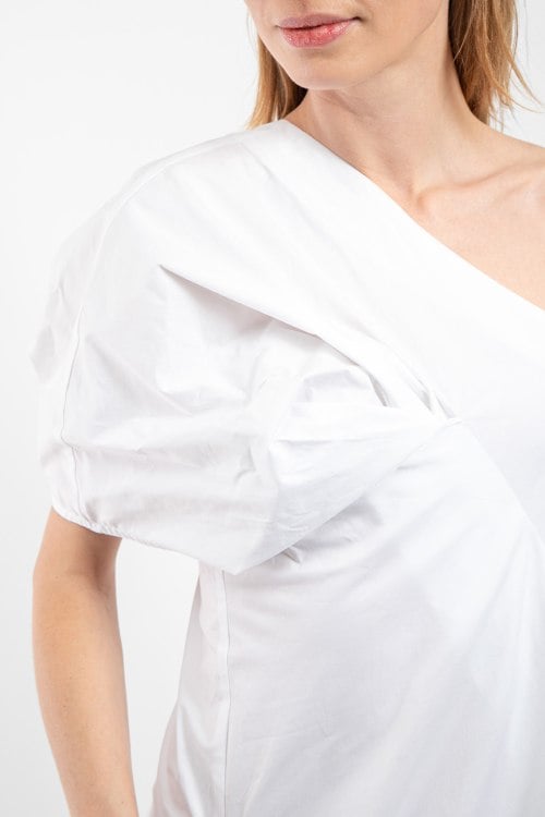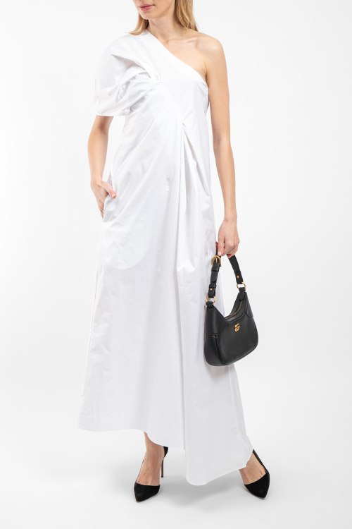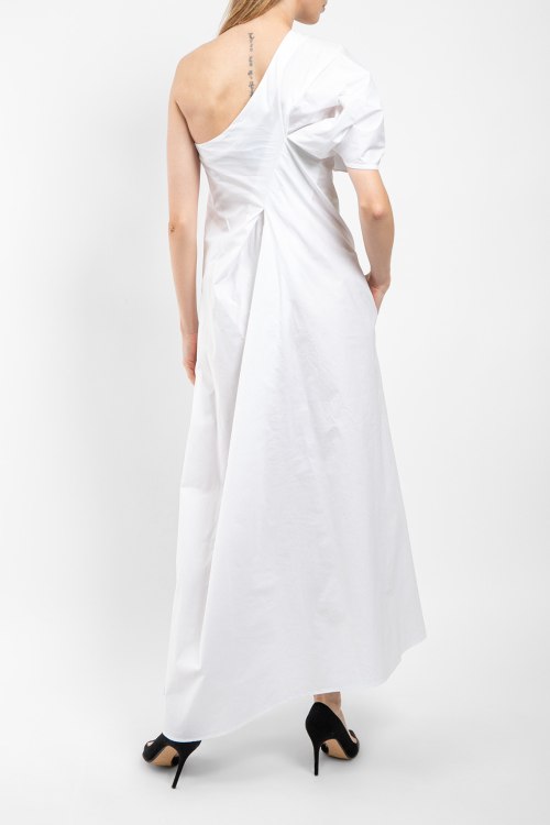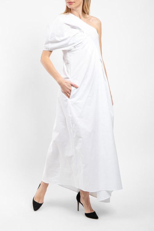 Женское белое хлопковое платье Malvina от Balossa (Балосса). Модель на одно плечо, один пышный короткий рукав, боковые карманы, свободный фасон, длина-макси.