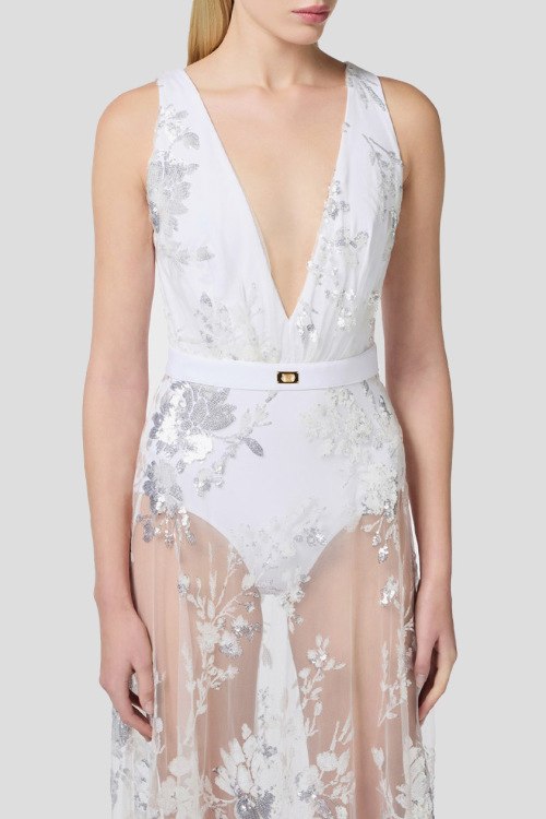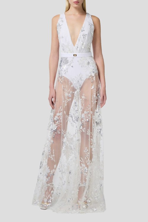 Детали: Женское белое платье из вискозы от Elisabetta Franchi (Елизабетта Франчи). Модель оформлена глубоким V-образным вырезом горловины и изысканным цветочным мотивом, вышитым блестящими пайетками на изящном тюле. Декор с логотипом на талии, длина-макси. Длина: 165 см (для 40-го итальянского размера). Рост модели — 177 см, размер — 40 (итальянский)