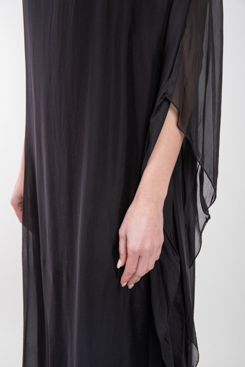 Женское черное платье из вискозы и шелка от Clothe (Клозе). Длина миди, V-образный вырез горловины, полупрозрачные рукава 3/4, асимметричный низ изделия. Замеры для размера M: длина: 129 см.