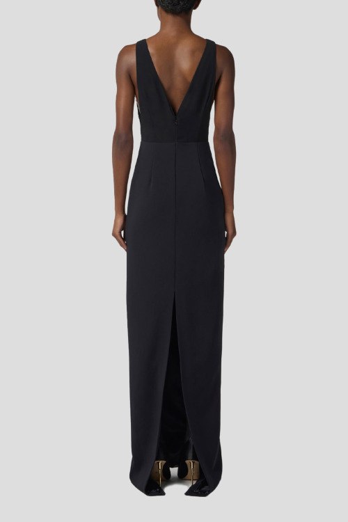 Детали: Женское черное платье Red Carpet от Elisabetta Franchi (Елизабетта Франчи). Приталенное вечернее платье из жоржета. Модель без рукавов оформлена глубоким вырезом декольте, украшенным роскошным декором с логотипом. Топ расшит кристаллами, придающими изделию блеск, а прямая юбка из крепа оформлена разрезом сбоку