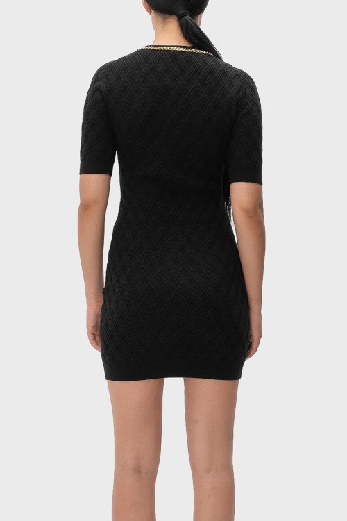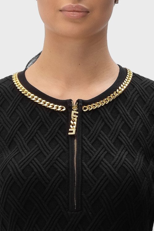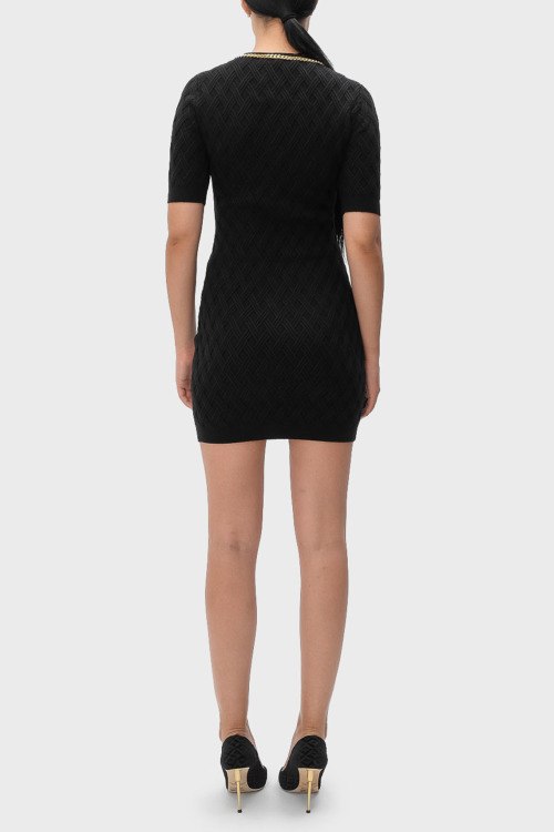 Детали: Женское черное коктейльное платье от Elisabetta Franchi (Елизабетта Франчи). Фактурный узор по всей поверхности, круглый вырез горловины с золотистой цепочкой, застежка-молния, короткий рукав, облегающий фасон, длина-мини