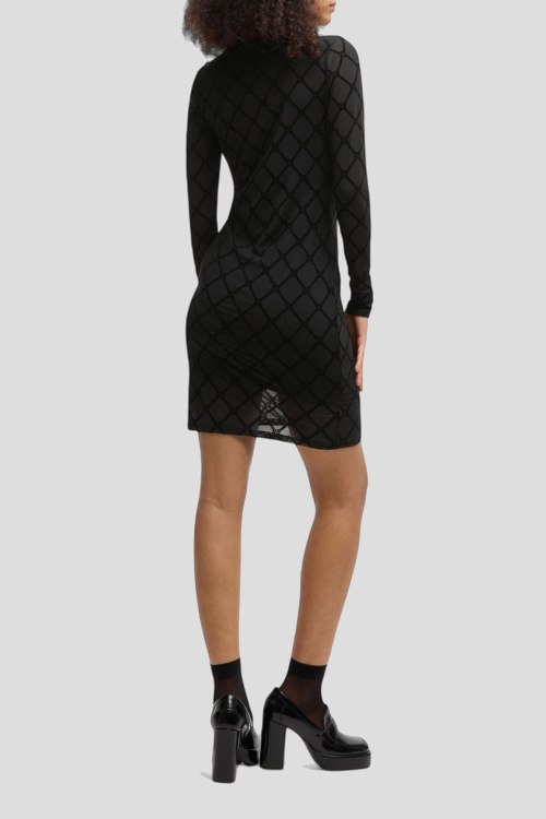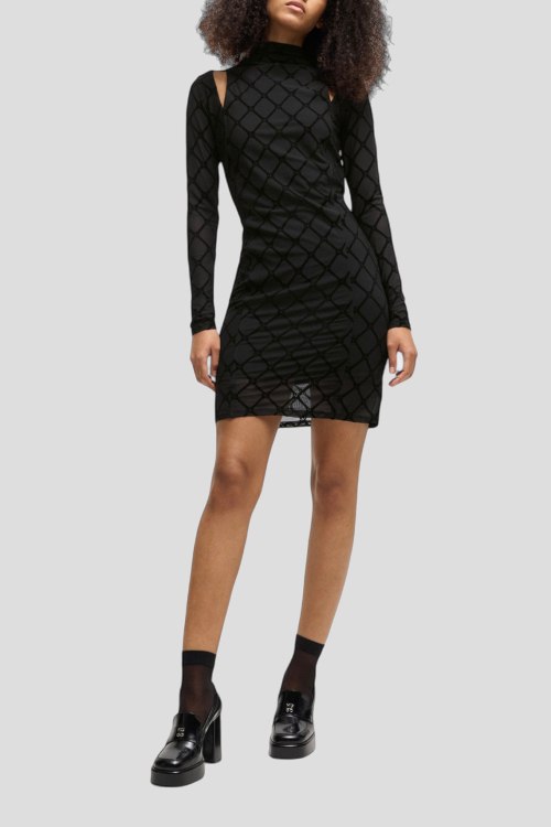 Детали: Женское черное платье Nehemir из полиэстера и эластана от Hugo by Hugo Boss (Хуго бай Хуго Босс). Облегающий силуэт, короткая длина, сетчатый материал, длинные рукава, вырезы на плечах, воротник-стойка
