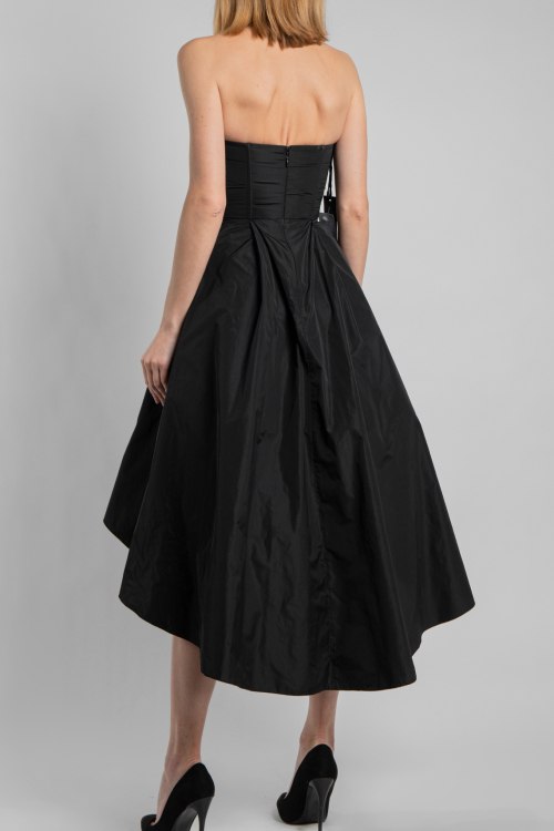 Женское черное платье от Pinko (Пинко). Дизайн с открытым верхом без бретелей, без рукавов, асимметричный крой, застежка-молния сзади.