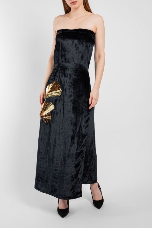 Женское черное платье из микса вискозы и шелка от Attico (Аттико). Длина макси, модель с открытыми плечами, дизайн на запах, завязывается на шелковые кулиски на спине, приталенный силуэт, ровный подол, модель декорирована сбоку аппликацией в виде лепестков золотистого цвета