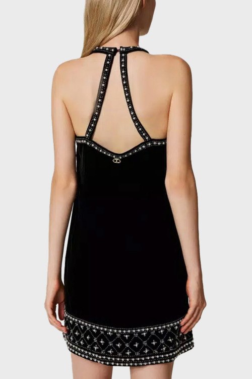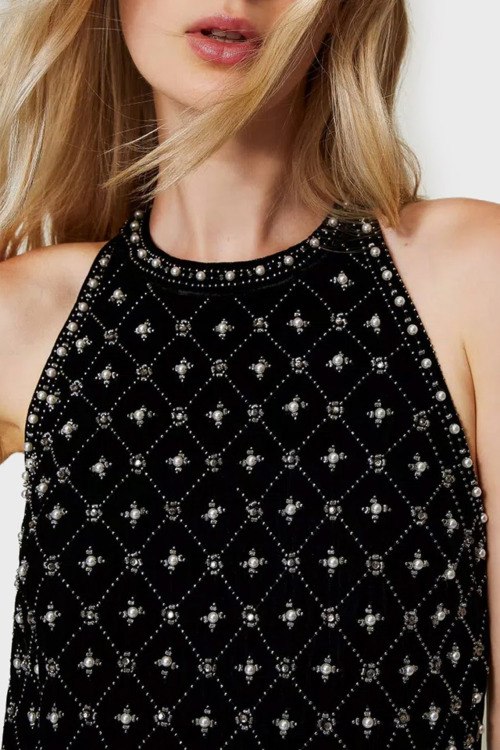 Детали: Женское черное платье из полиэстера от TWINSET (Твинсет). Короткая длина, круглый вырез горловины, без рукавов, открытая спина, модель декорирована кристаллами, бисером и бусинами, ровный низ изделия