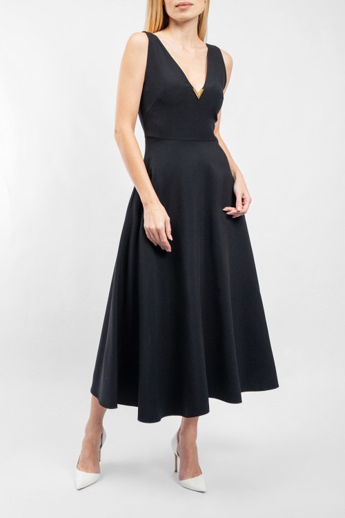 Детали: Женское черное платье из шерсти и шелка от Valentino (Валентино). Модель А-силуэта без рукавов, V-образный вырез на груди и на спине, золотистый значок V на груди, застежка-молния сбоку, длина-миди