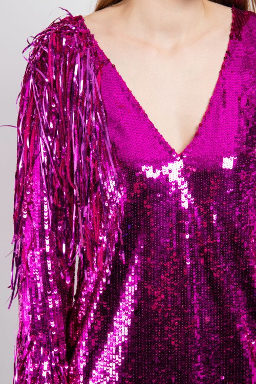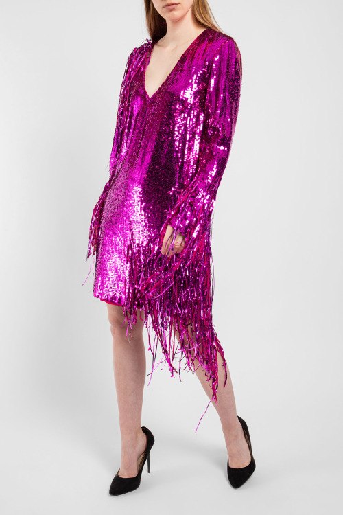 Женское фиолетовое платье из полиэстера от MSGM (ЭмСиДжиЭм). Короткая длина, V-образный вырез горловины, длинные рукава, дизайн в пайетках, декорированы бахромой вдоль рукавов и сбоку изделия.