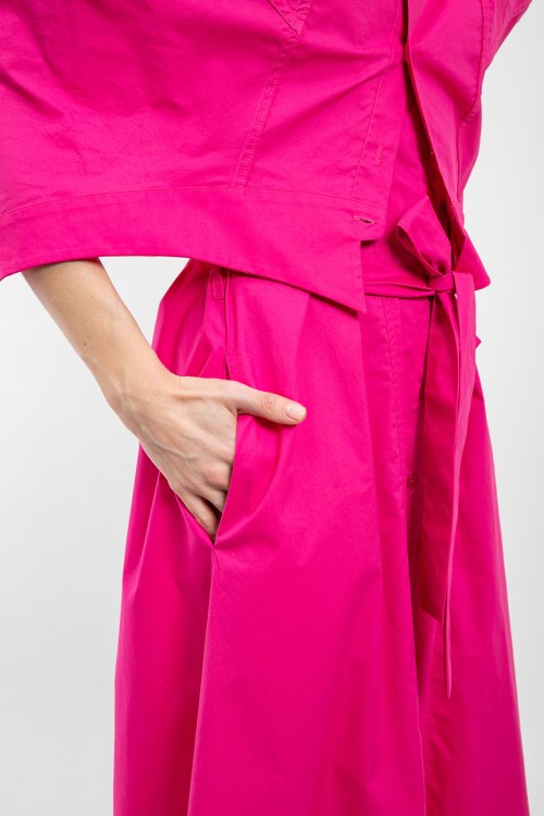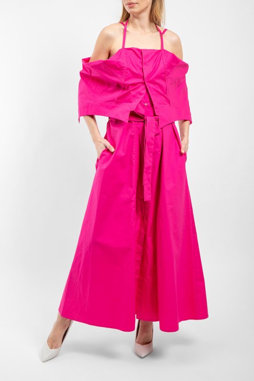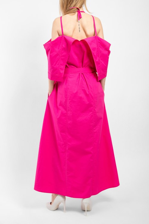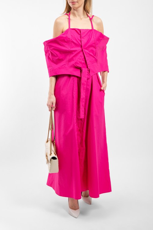 Женское хлопковое платье цвета фуксии Sonnet от Balossa (Балосса). Модель с открытым верхом, тонкие регулируемые бретели, в талии с поясом, боковые карманы, застежка на пуговицы, длина-макси.
