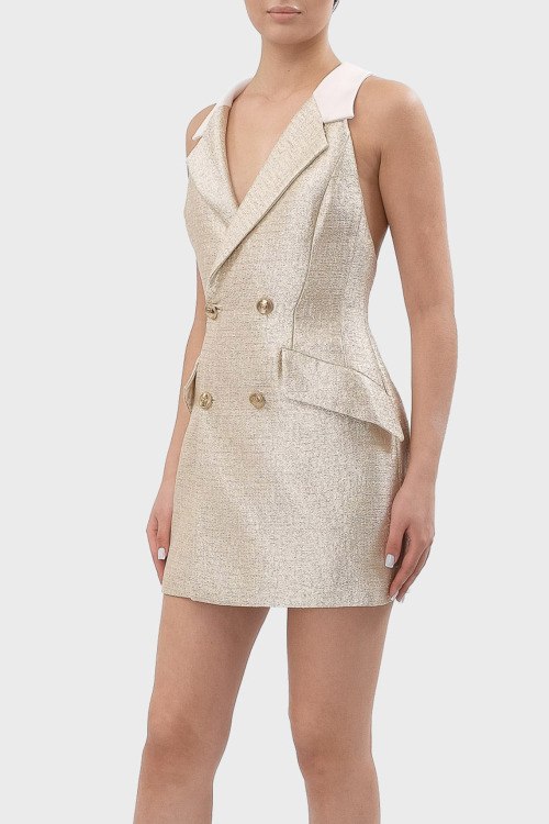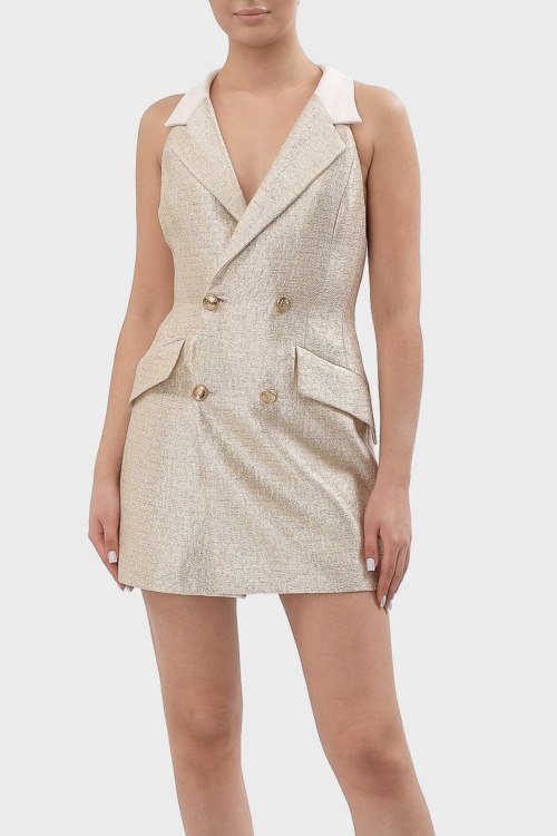 Детали: Женское золотистое платье-жакет от Elisabetta Franchi (Елизабетта Франчи). Модель без рукавов, двубортный фасон, отложной воротник с заостренными лацканами, застежка на пуговицы, длина-мини