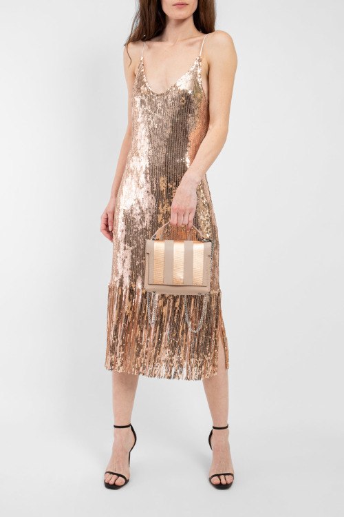 Женское золотистое платье от Timiami (Тимами). Модель полностью усыпана пайетками, тонкие бретели, глубокий вырез декольте, нижний край с бахромой, длина-миди