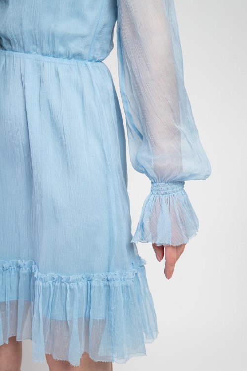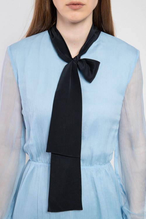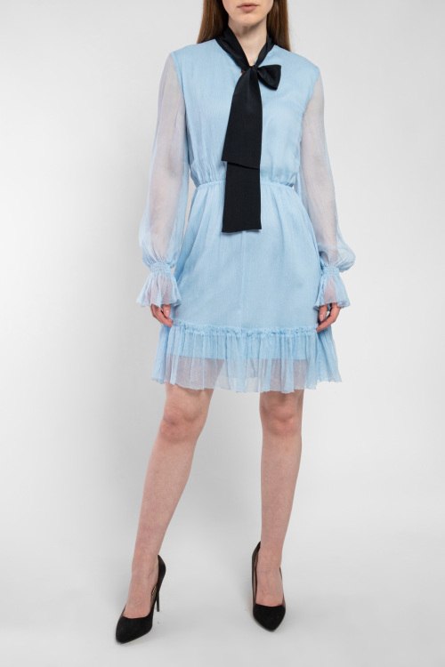 Женсое голубое шелковое платье от Pinko (Пинко). Декор черным баном, на подкладке, длинный полупрозрачный рукав с расклешенными манжетами, по линии талии на мягкой эластичной резинке, длина до колен