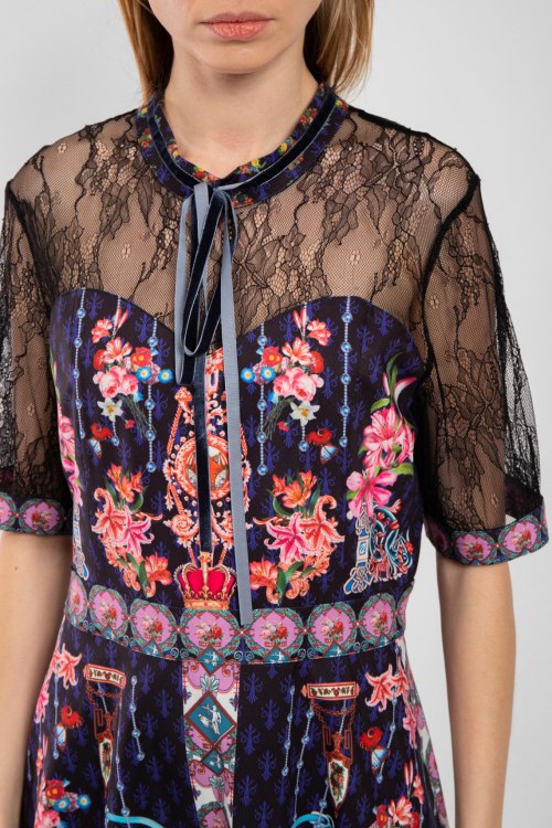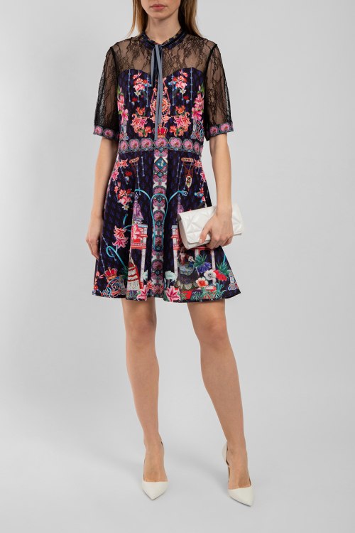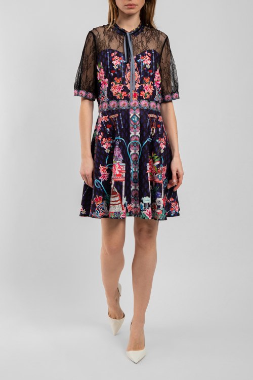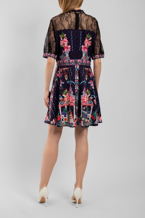 Женское платье из хлопка и полиэстера от Buby S (Баби Эс). Короткая длина, круглый вырез горловины, гипюровая вставка черного цвета, короткие рукава, застежка-молния на спине, приталенный силуэт, расклешенная юбка, дизайн с принтом. Замеры для размера М: длина: 89 см, ширина по груди: 46 см, ширина по талии : 40 см, ширина по бедрам: 56 см, длина рукава по внутреннему шву: 13 см, ширина рукава: 19 см.