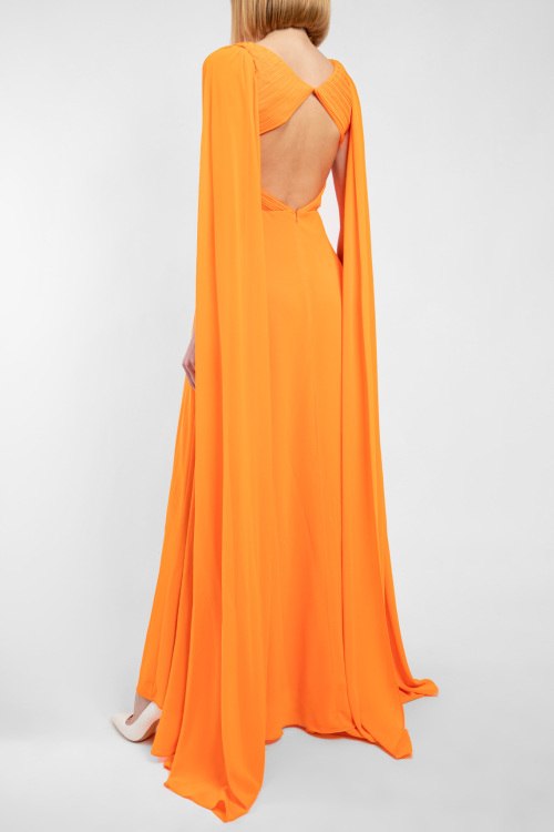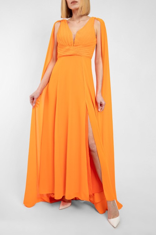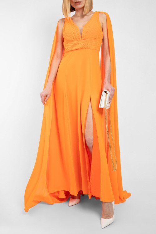 Детали: Женское оранжевое платье от No Secrets (Ноу Сикретс). Модель без рукавов, V-образный вырез декольте, открытая спинка, длинные вшитые ленты на плечах, застежка-молния на спине, глубокий разрез на ноге сбоку, длина-макси