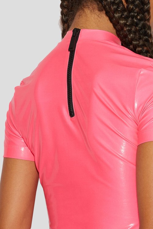 Детали: Женское розовое латексное платье Jamaica от Dsquared2 (Дискваред). Воротник-стойка, принт с логотипом на груди, застежка-молния на спине, короткий рукав, облегающий фасон, короткая длина