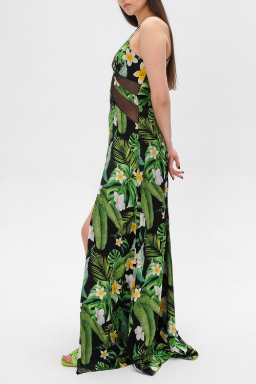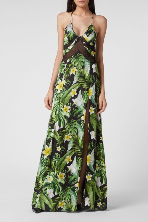 Детали: Женское зеленое шелковое платье Hawaii от Philipp Plein (Филипп Плейн). Тропический принт, тонкие бретельки, V-образный вырез декольте, полупрозрачные вставки, открытая спинка, глубокий разрез сбоку, длина-макси