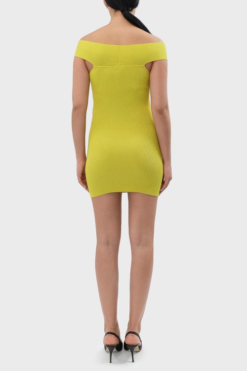 Детали: Женское желтое трикотажное платье от Elisabetta Franchi (Елизабетта Франчи). Модель без рукавов, дизайн в рубчик, облегающий фасон, металлические значки логотипа, длина-мини