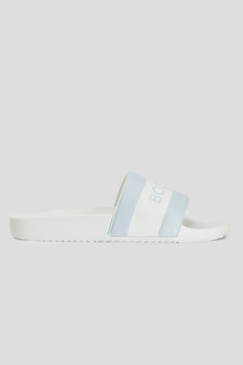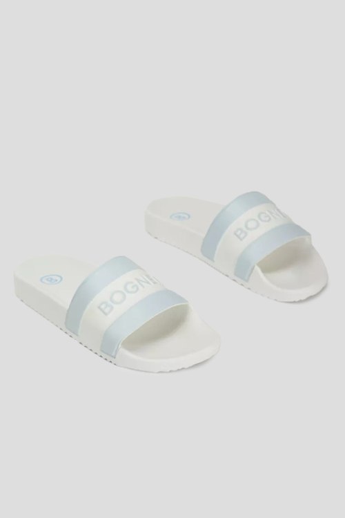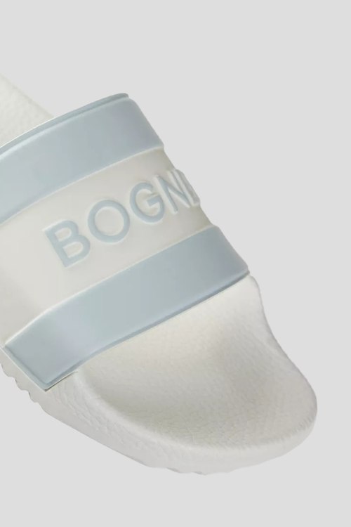 Детали: Женские бело-голубые резиновые слайдеры от Bogner (Богнер). Широкий ремешок с логотипом, закругленный носок, анатомическая стелька