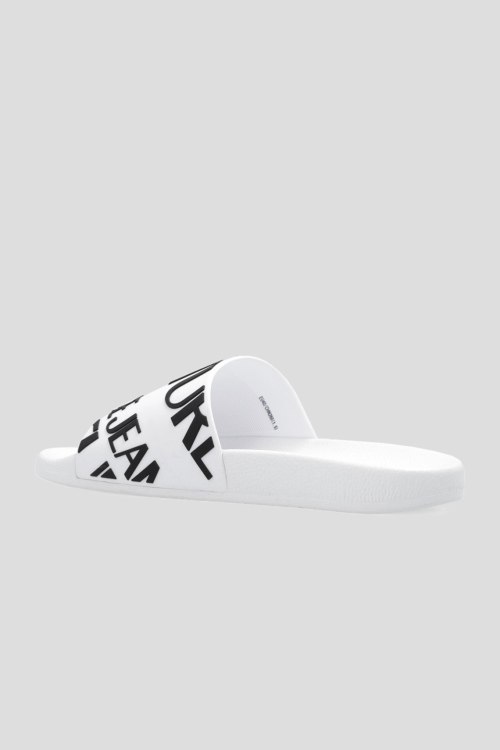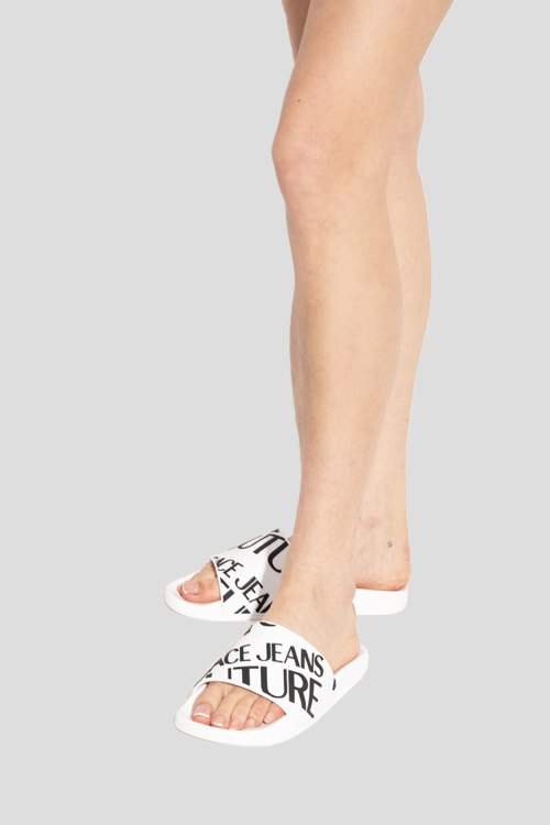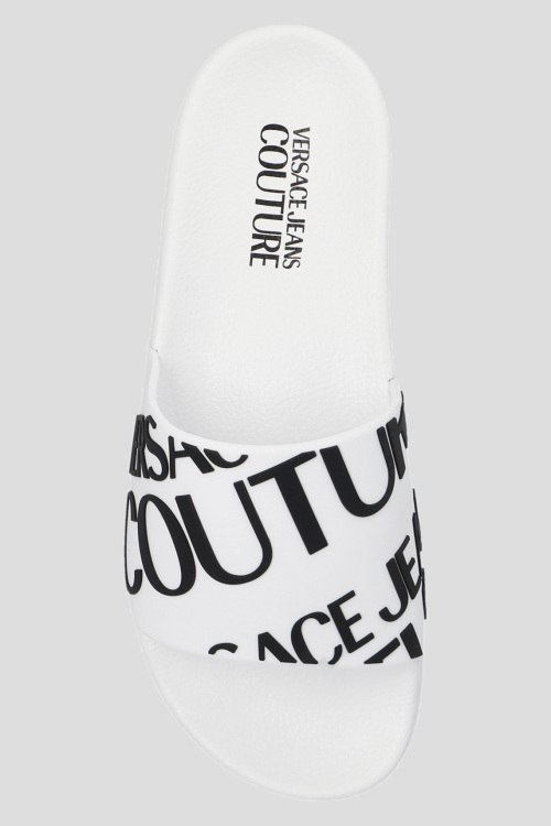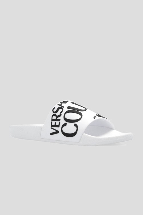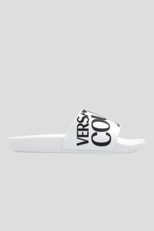 Женские белые слайдеры от Versace (Версаче). Широкий ремешок с логотипом, закругленный носок, стелька с логотипом. р.40 - 28 см