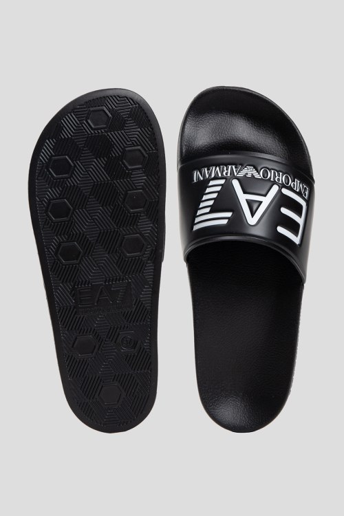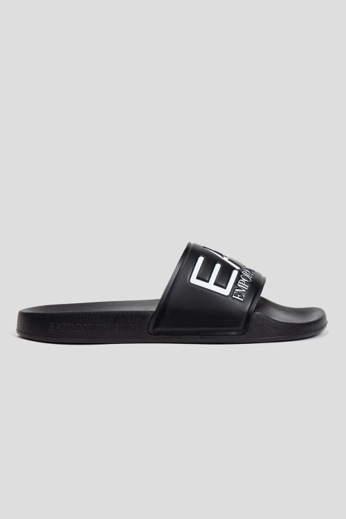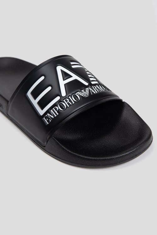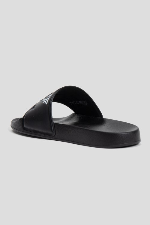 Детали: Женские черные слайдеры из резины от Armani (Армани). Закругленный носок, широкий ремешок, логотип бренда, анатомическая стелька