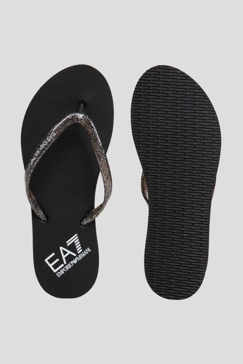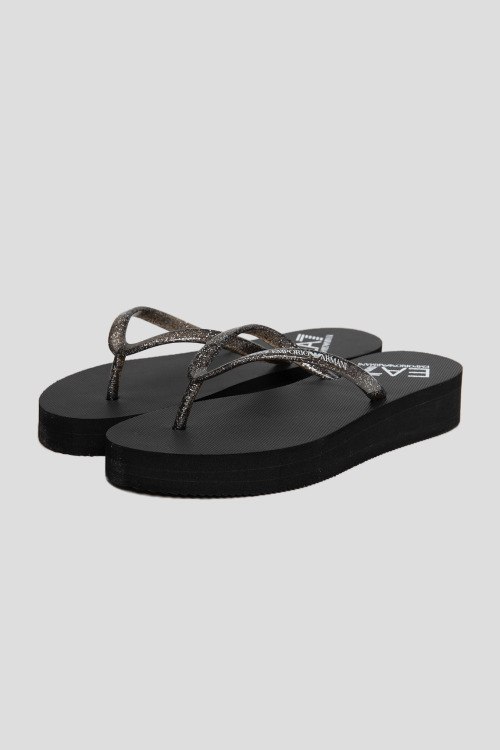 Детали: Женские черные вьетнамки из ПВХ от EA7 Emporio Armani (ЕА7 Эмпорио Армани). Закругленный носок, дизайн на платформе, тонкие ремешки с логотипом бренда. Высота платформы: 3.5 см
