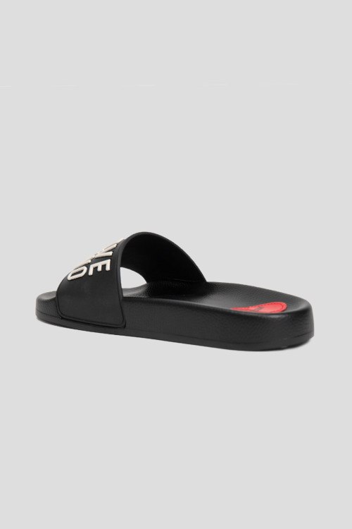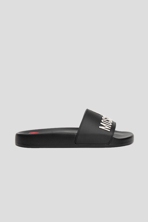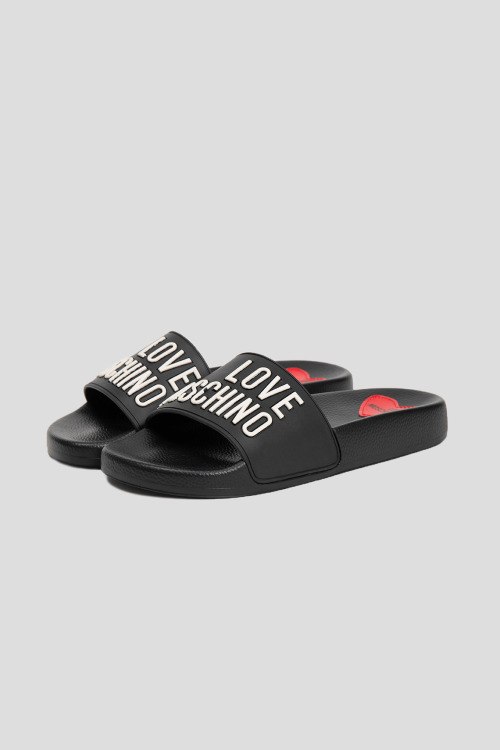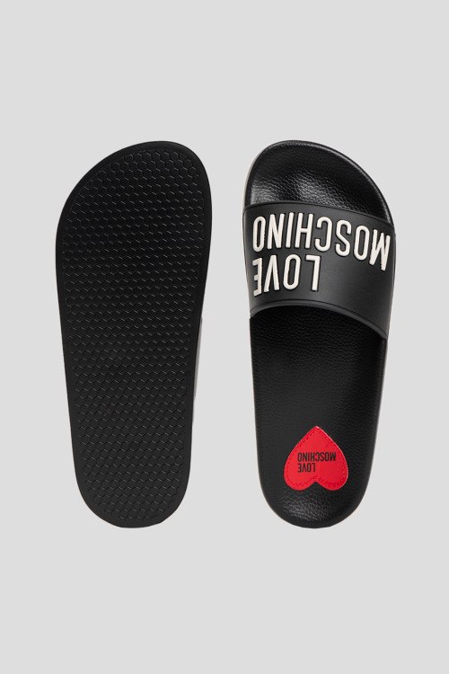 Детали: Женские черные слайдеры из эластана от Love Moschino (Лав Москино). Закругленный носок, широкий ремешок с логотипом бренда, анатомическая стелька