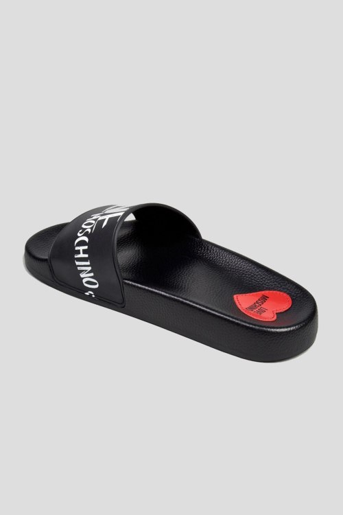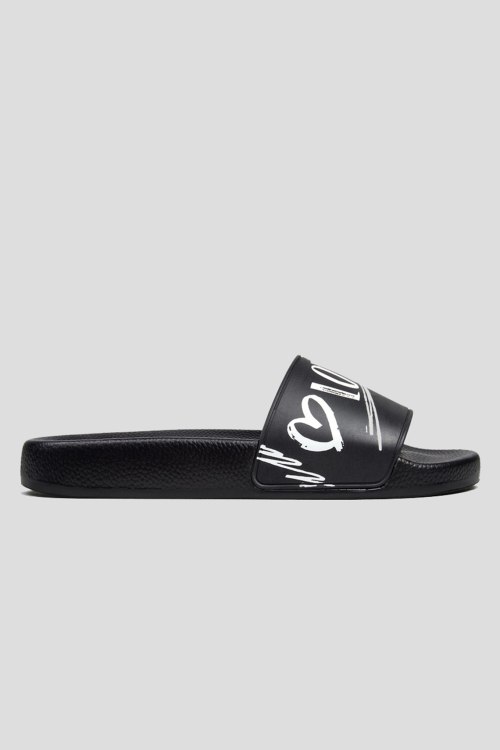 Детали: Женские черные резиновые слайдеры от Love Moschino (Лав Москино). Широкий ремешок с логотипом, закругленный носок, анатомическая стелька