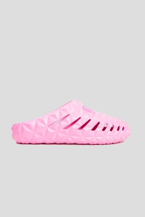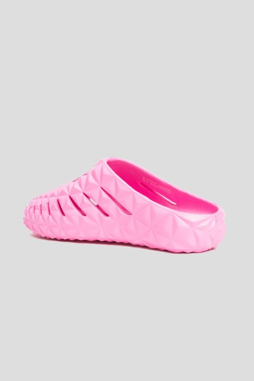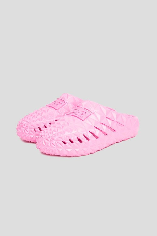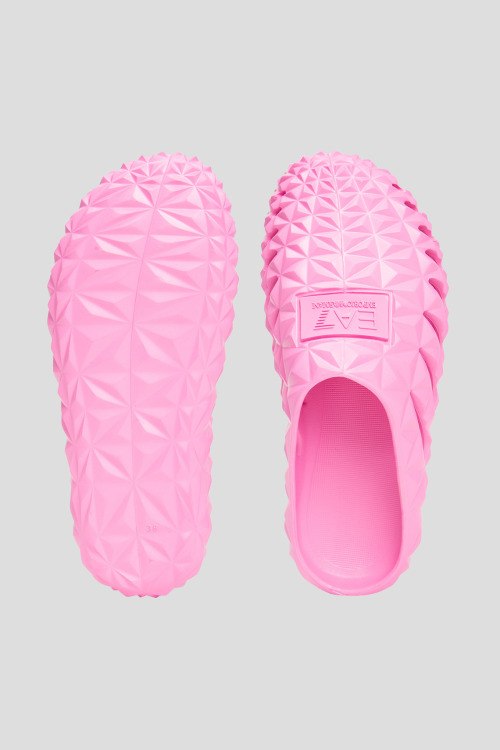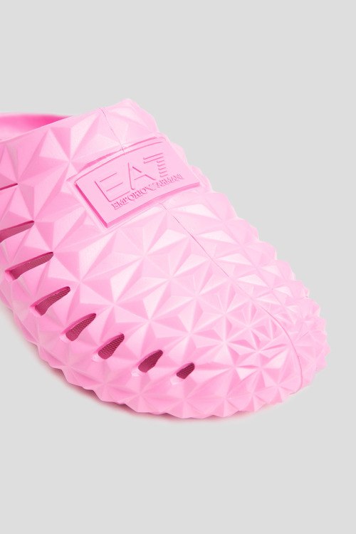 Женские розовые слайдеры от EA7 Emporio Armani (ЕА7 Эмпорио Армани). Закругленный носок закрытый, патч-лого, фактурная поверхности, плоская подошва