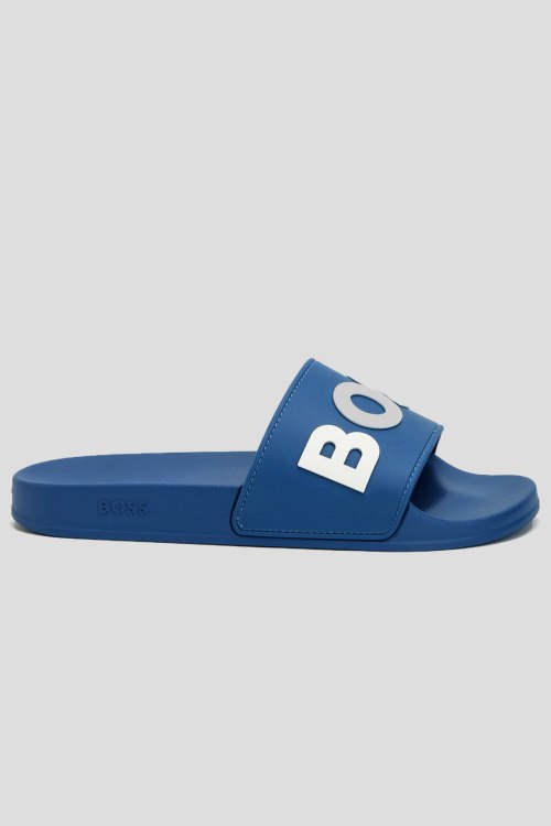 Женские синие слайдеры из резины от Hugo Boss (Хуго Босс). Закругленный носок, широкий ремешок с логотипом бренда, анатомическая стелька,