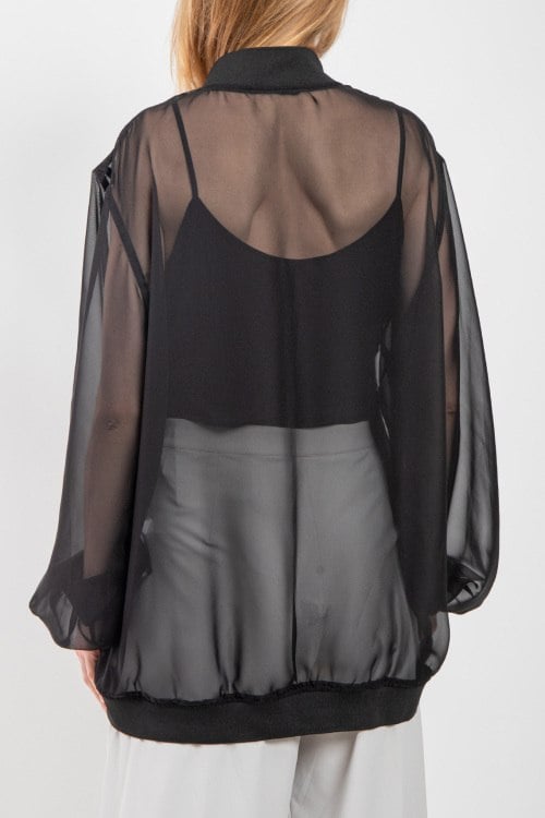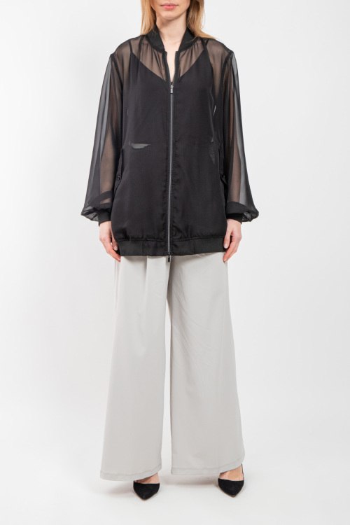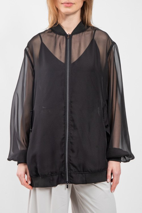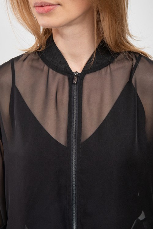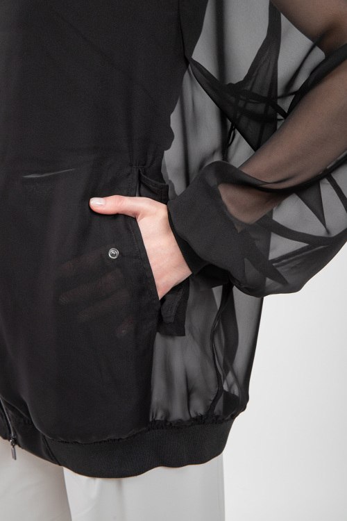 Детали: Женский черный бомбер из полиэстера от Diego M (Диего М). Полупрозрачная модель, застежка на молнию, прорезные карманы на кнопке, трикотажная резинка на манжетах и по низу изделия
