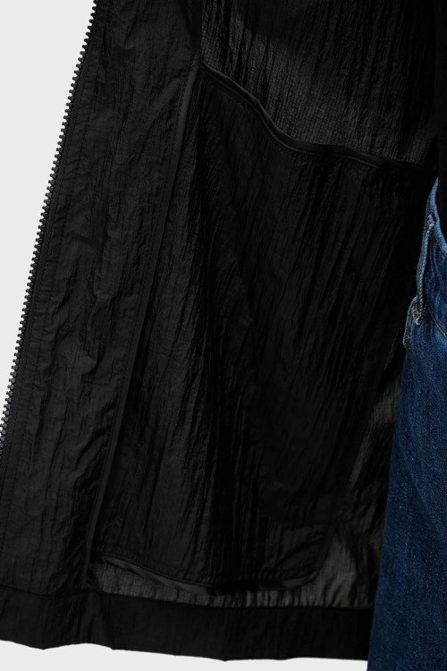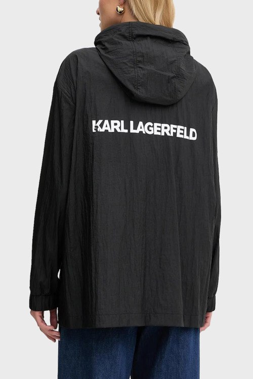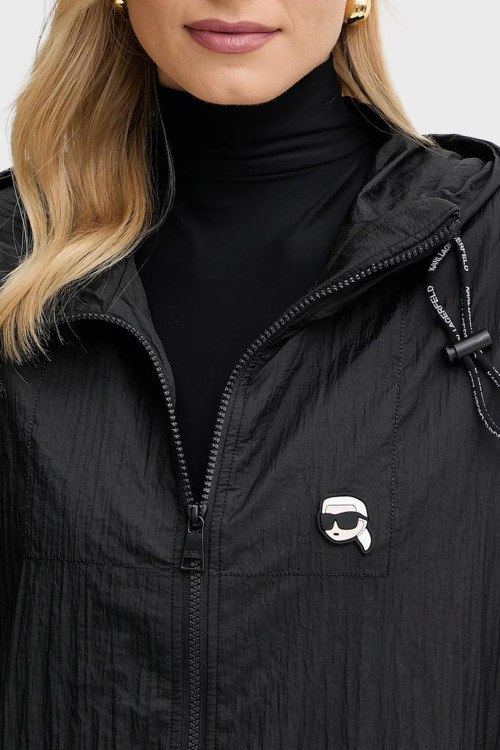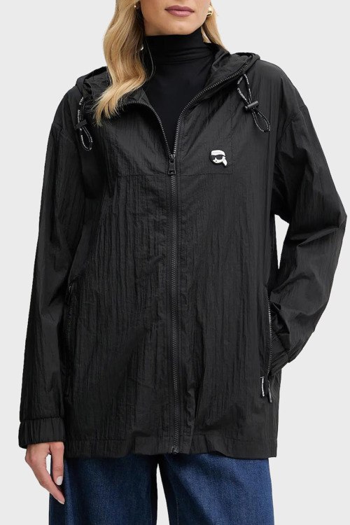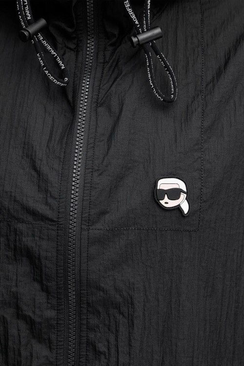 Детали: Женская черная нейлоновая ветровка Ikon от Karl Lagerfeld (Карл Лагерфельд). Вшитый капюшон, нашивка на груди, принт с логотипом на спине, боковые карманы на молнии, застежка-молния, манжеты на резинке, удлиненная длина