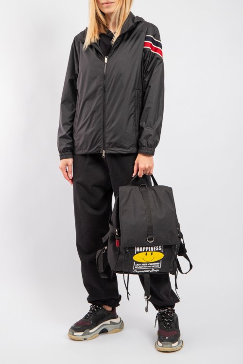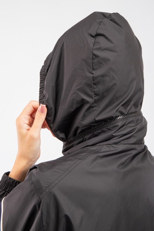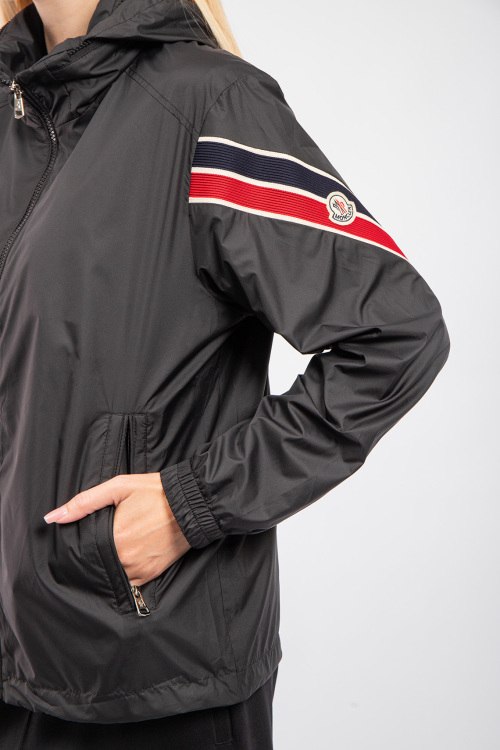 Женская черная ветровка от Moncler (Монклер). Вшитый капюшон, нашивка с логотипом на рукаве, боковые карманы на молнии, застежка-молния, манжеты на резинке, классическая длина.