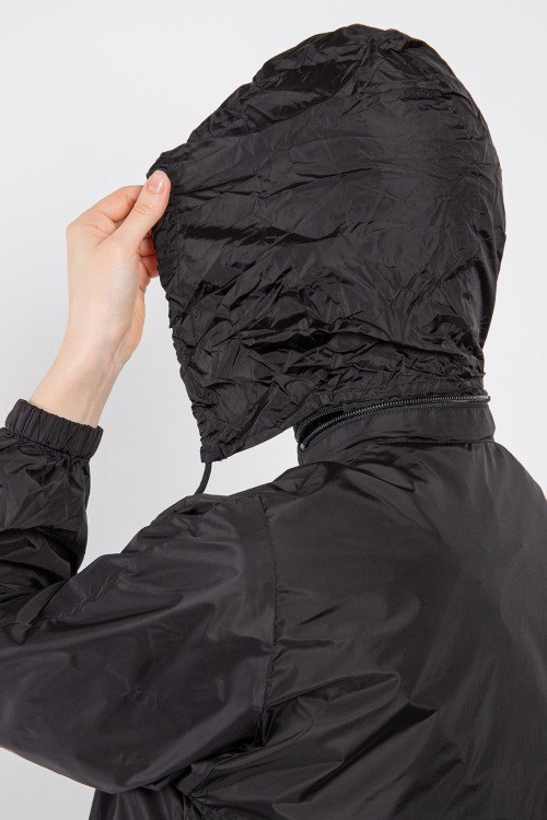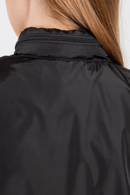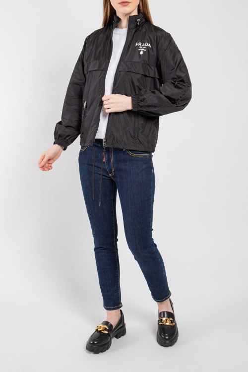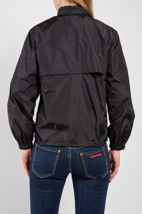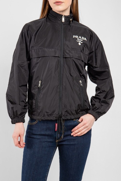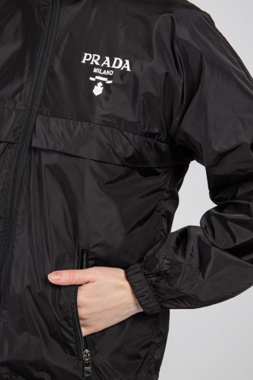 Женская черная ветровка из полиэстера от Prada (Прада). Классическая длина, высокий воротник-стойка, застежка на молнию, съемный капюшон, прорезные боковые карманы на молнии, принт с логотипом бренда на груди, эластичная резинка на манжетах
