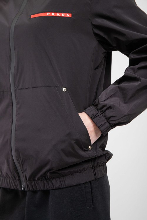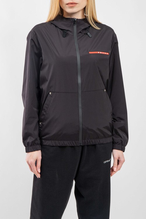 Женская черная ветровка из полиэстера от Prada (Прада). Классическая длина, застежка на молнию, вшитый капюшон, накладные карманы, логотип бренда на груди. Замеры для размера: 48; длина - 65,5 см; ПОГ - 55,5 см; ПОТ - 53 см; ПОБ - 50 см; длина по внутреннему шву рукава - 44 см; ширина рукава - 21 см.