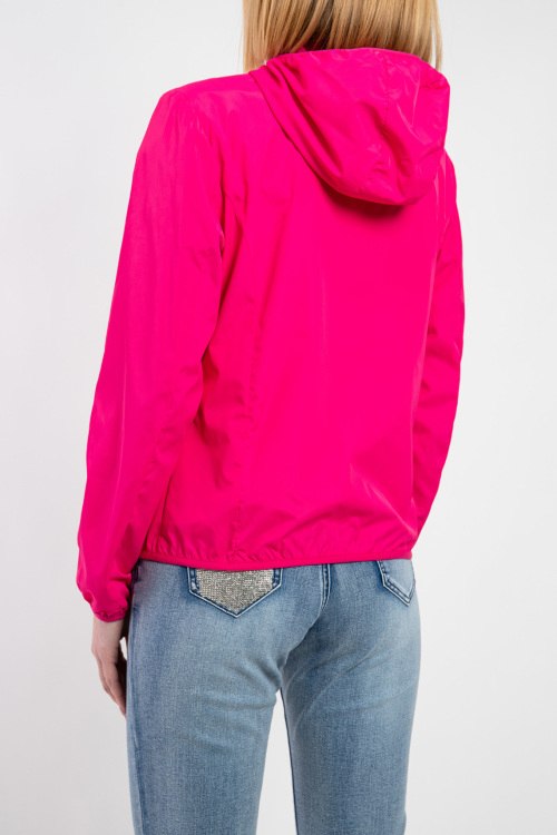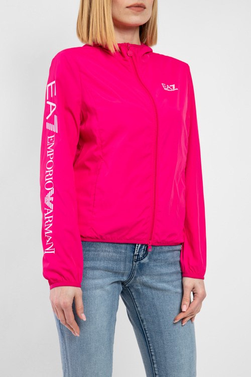 Женская розовая ветровка от EA7 Emporio Armani (ЕА7 Эмпорио Армани). Вшитый капюшон, принт с логотипом на груди и на рукаве, боковые карманы, застежка-молния, манжеты и нижний край на резинке