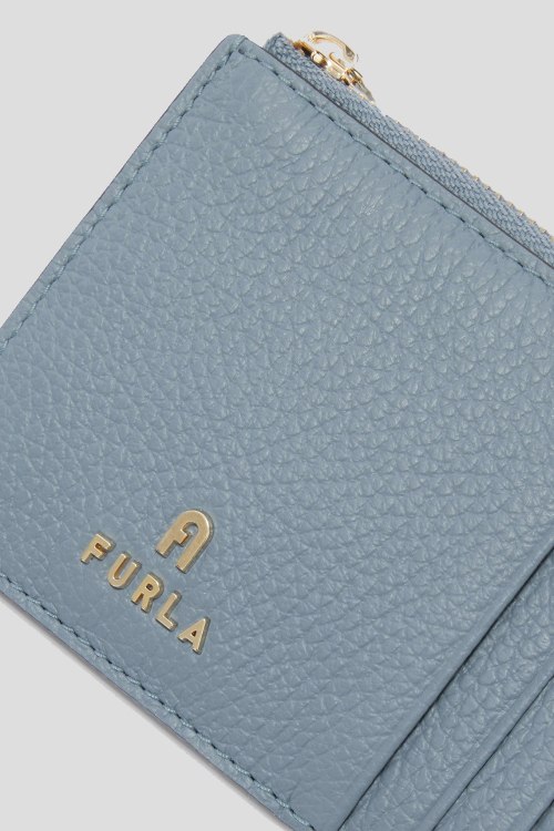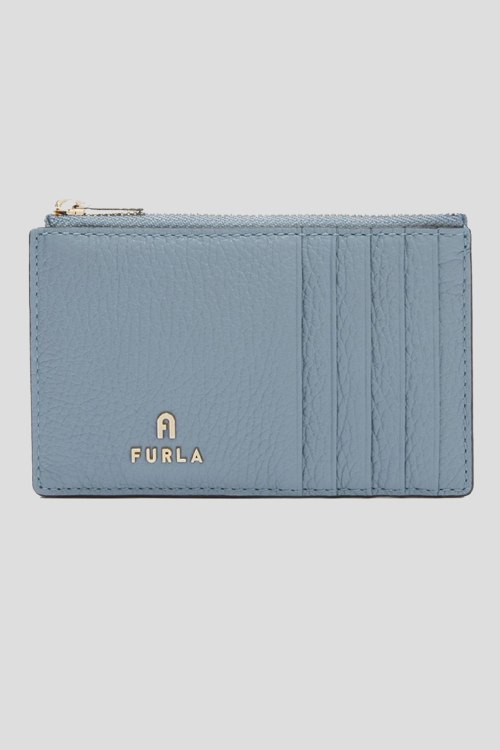 Детали: Женский голубой картхолдер Camelia из телячьей натуральной кожи от Furla (Фурла). Металлический логотип бренда, прямоугольная форма, карман на молнии, десять слотов для кредитных карт. Размер 13х8х1 см