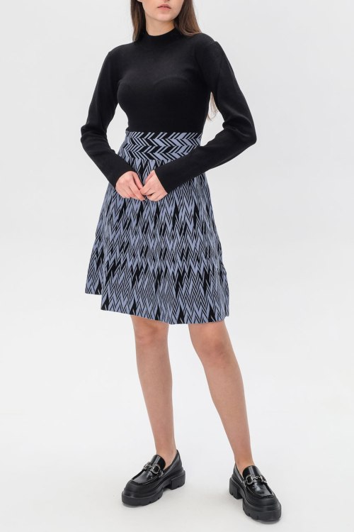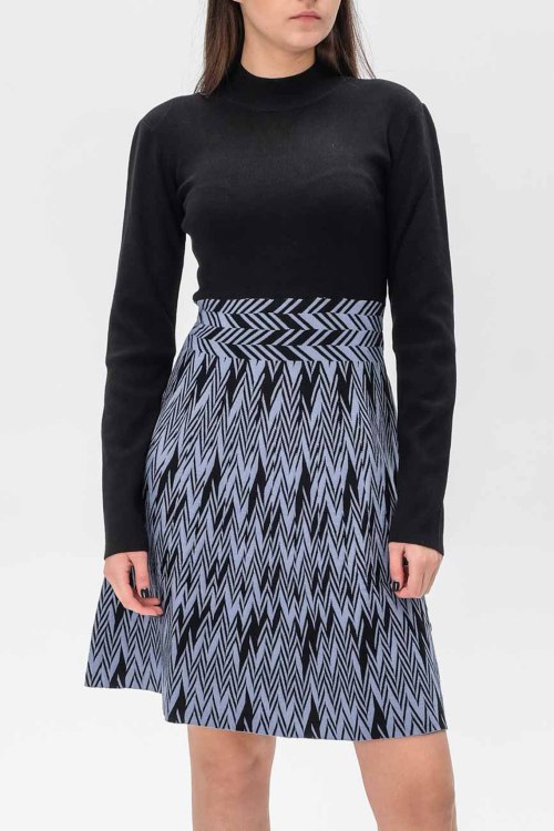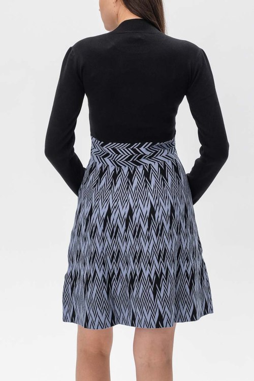 Детали: Женское черно-голубое платье из вискозного микса от Emporio Armani (Эмпорио Армани). Короткая длина, высокий воротник-стойка, длинные рукава, приталенный силуэт, комбинированный дизайн, ровный подол