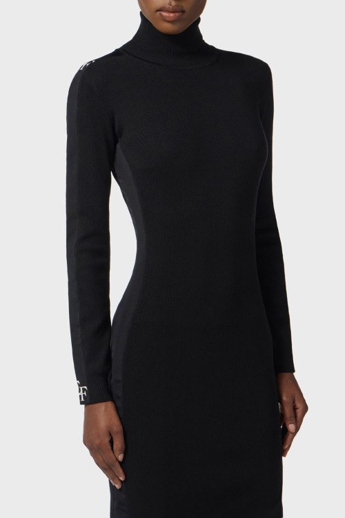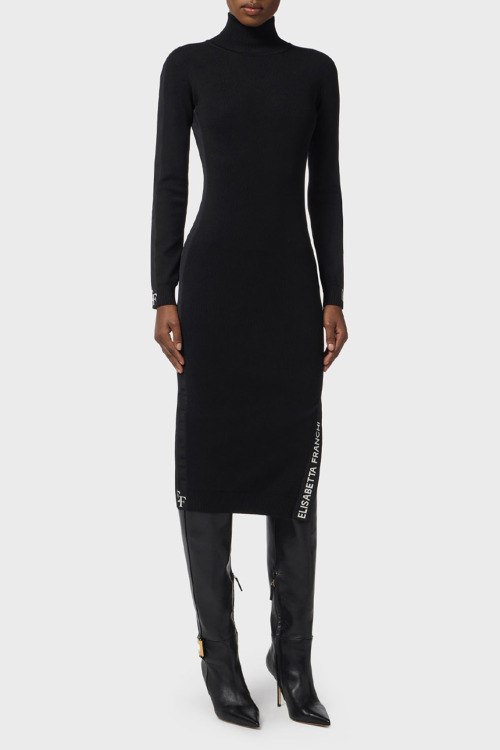 Детали: Женское черное трикотажное платье от Elisabetta Franchi (Елизабетта Франчи). Высокая горловина, вышитый логотип, длинный рукав, облегающий фасон, разрез сбоку, длина-миди